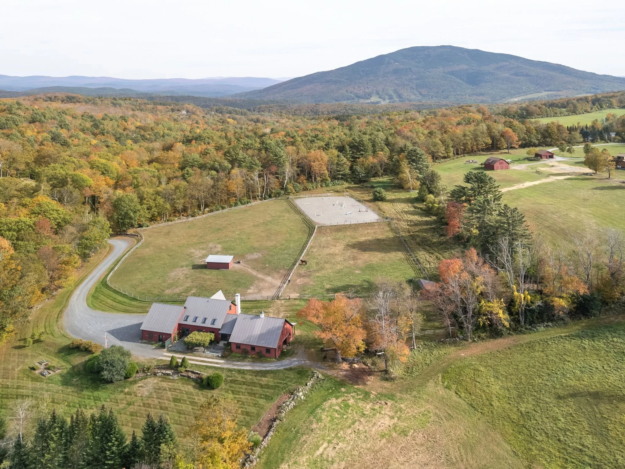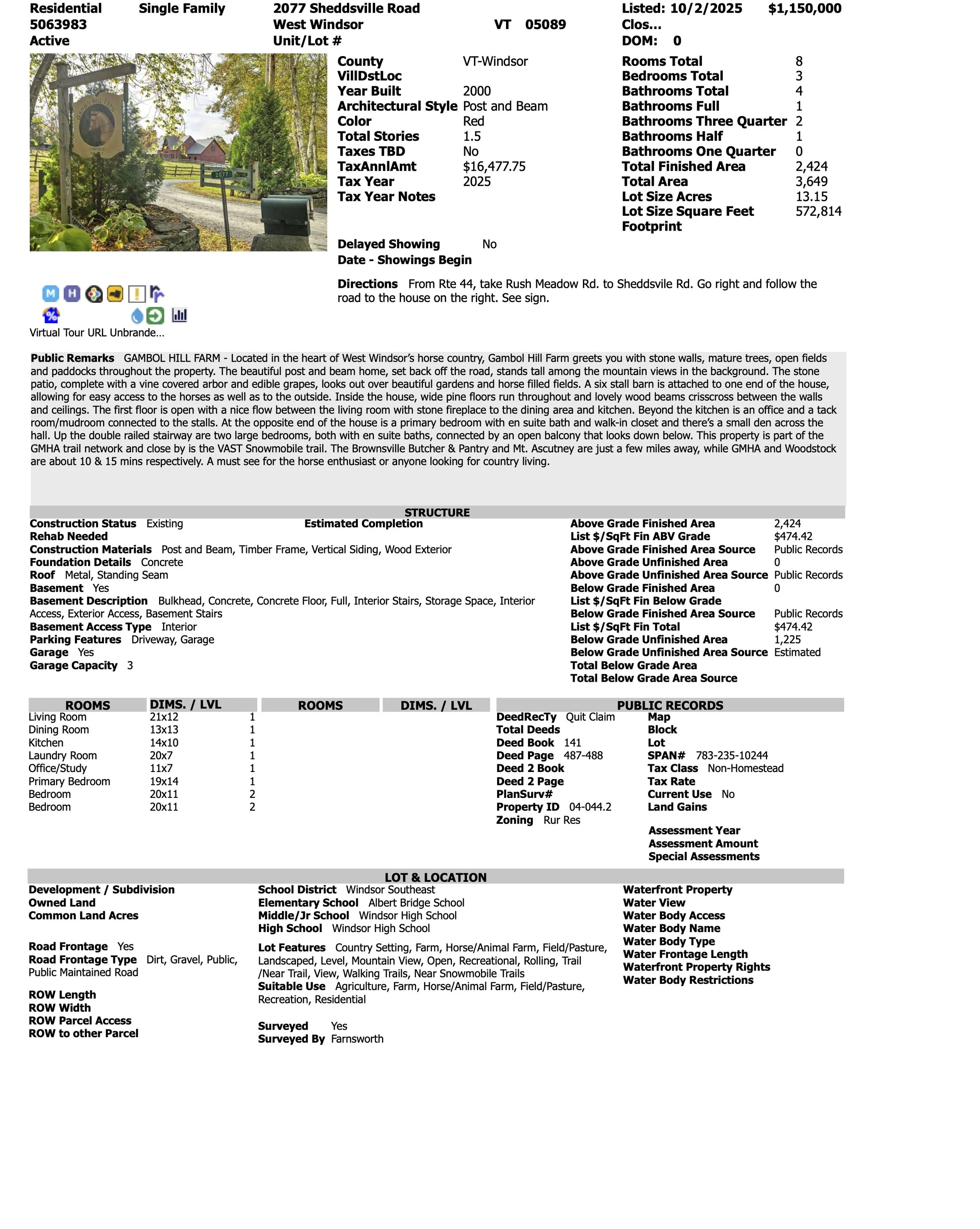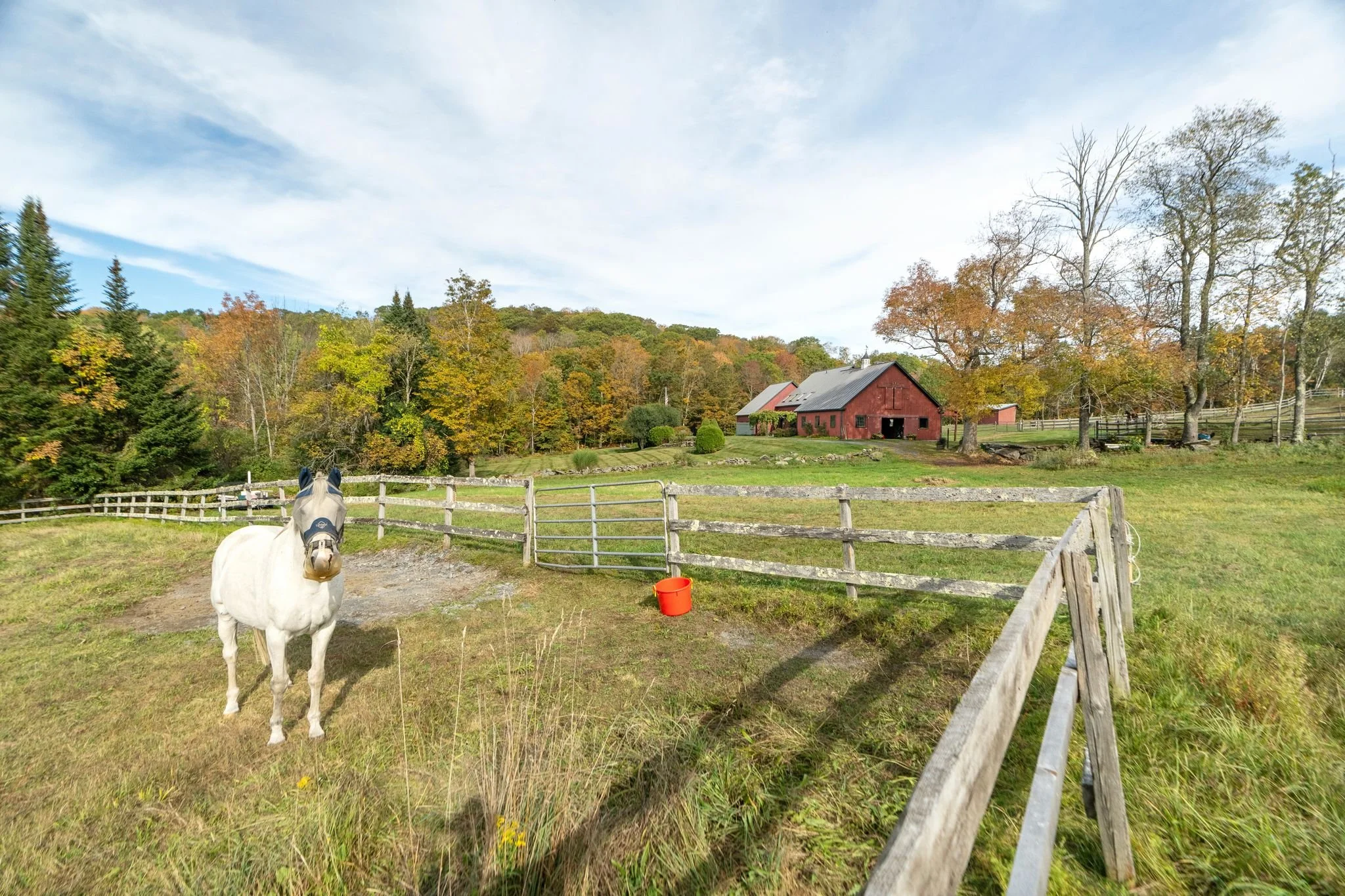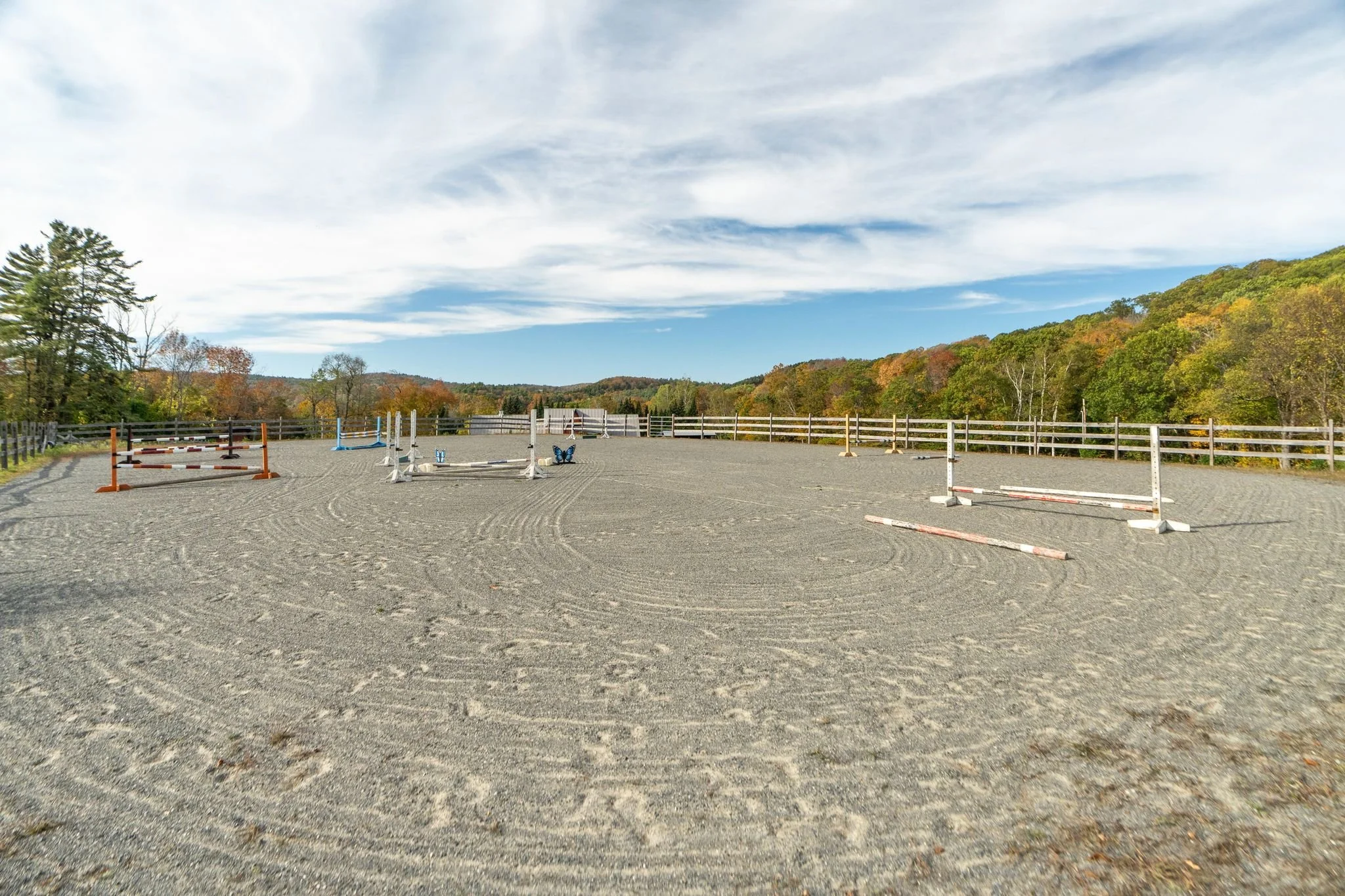 GAMBOL HILL FARM- Located in the heart of West Windsor’s horse country, Gambol Hill Farm greets you with stone walls, mature trees, open fields and paddocks throughout the property. The beautiful post and beam home, set back off the road, stands tall among the mountain views in the background. The stone patio, complete with a vine covered arbor and edible grapes, looks out over beautiful gardens and horse filled fields. A six stall barn is attached to one end of the house, allowing for easy access to the horses as well as to the outside. Inside the house, wide pine floors run throughout and lovely wood beams crisscross between the walls and ceilings. The first floor is open with a nice flow between the living room with stone fireplace to the dining area and kitchen. Beyond the kitchen is an office and a tackroom/mudroom connected to the stalls. At the opposite end of the house is a primary bedroom with en suite bath and walk-in closet and there’s a small den across the hall. Up the double railed stairway are two large bedrooms, both with en suite baths, connected by an open balcony that looks down below. This property is part of the GMHA trail network and close by is the VAST Snowmobile trail. The Brownsville Butcher & Pantry and Mt. Ascutney are just a few miles away, while GMHA and Woodstock are about 10 & 15 mins respectively. A must see for the horse enthusiast or anyone looking for country living.