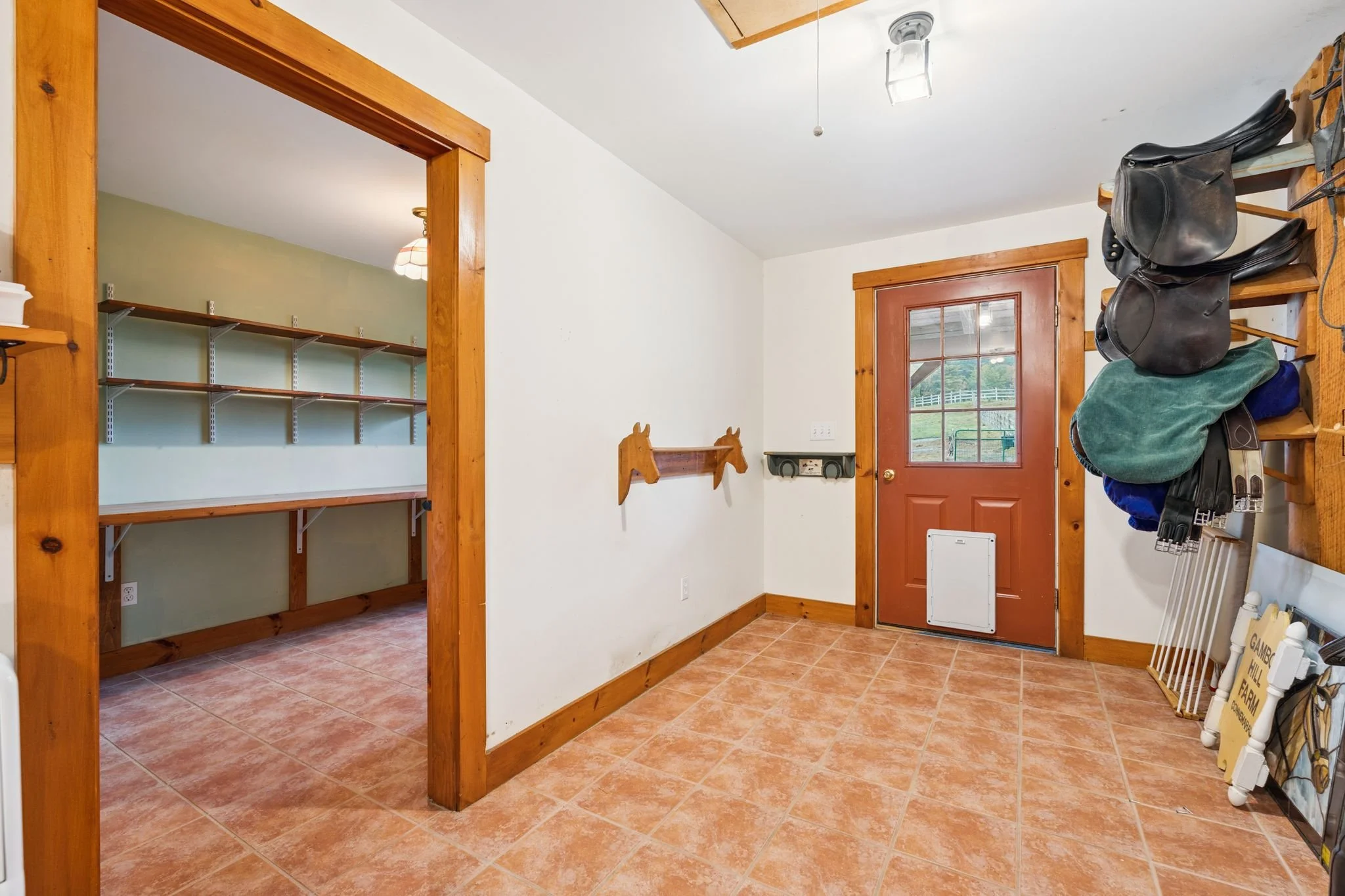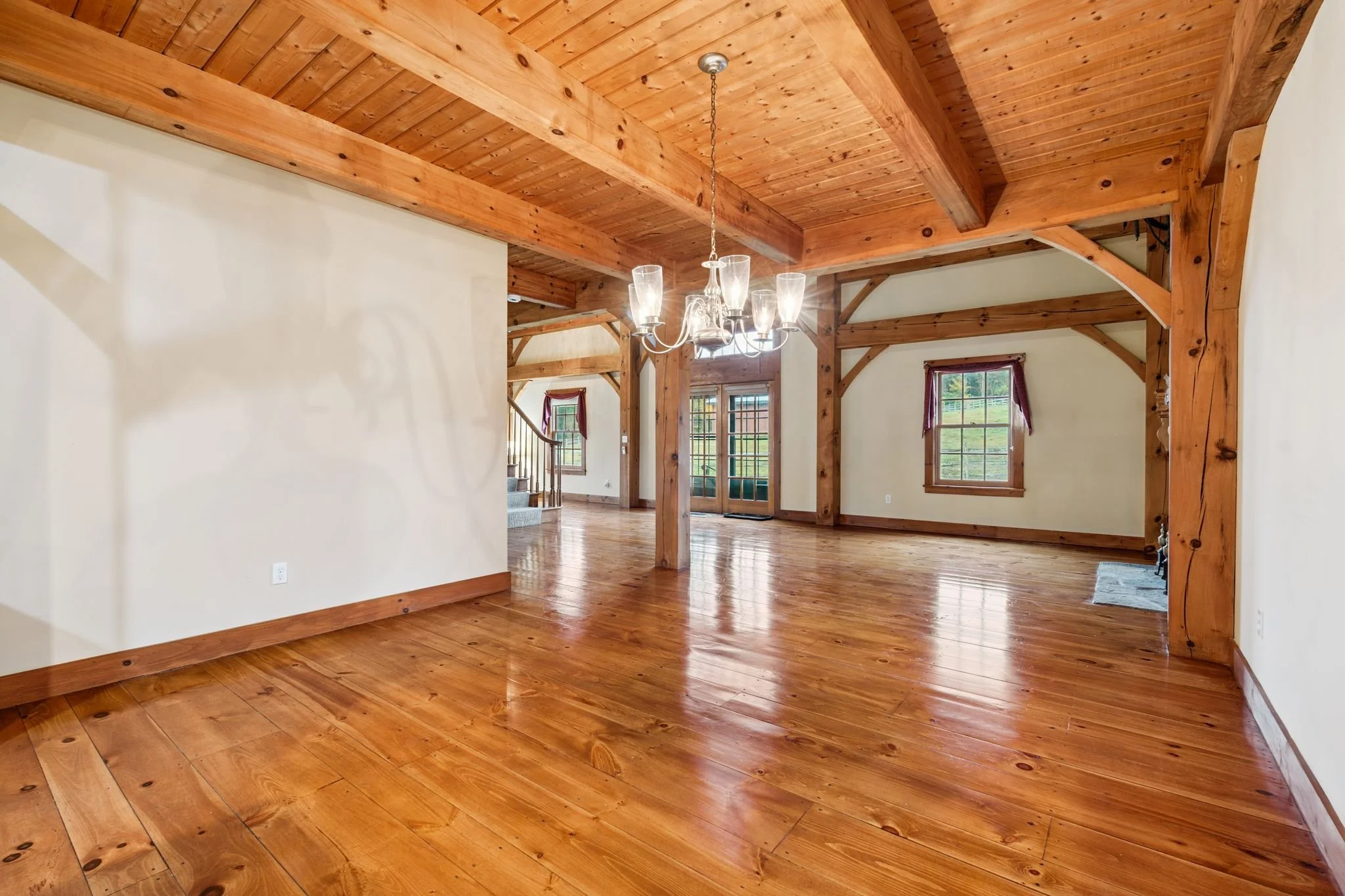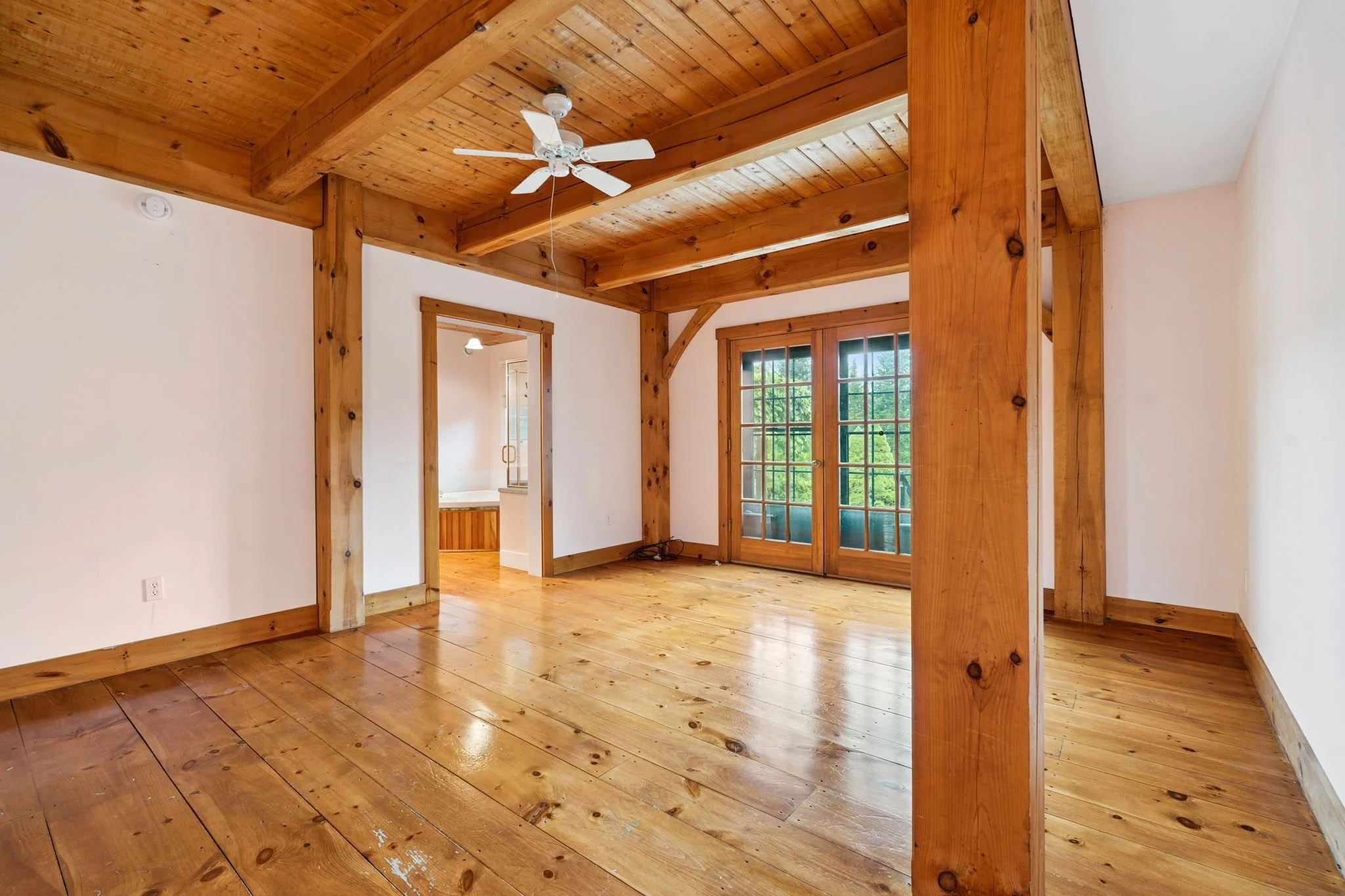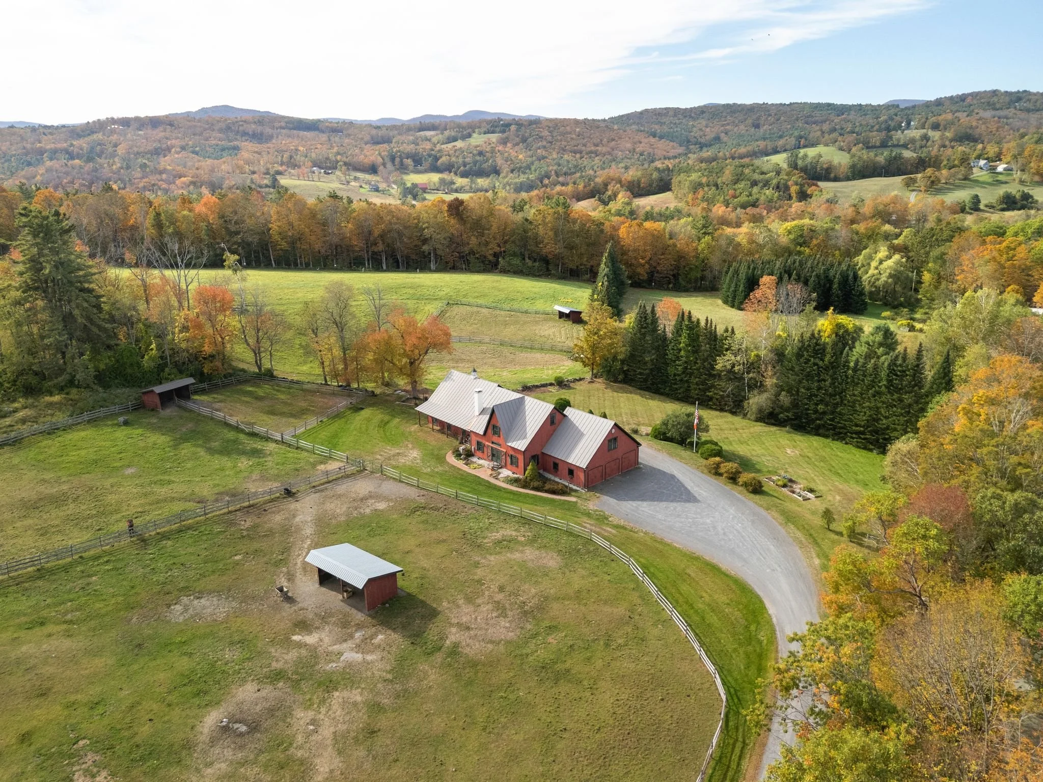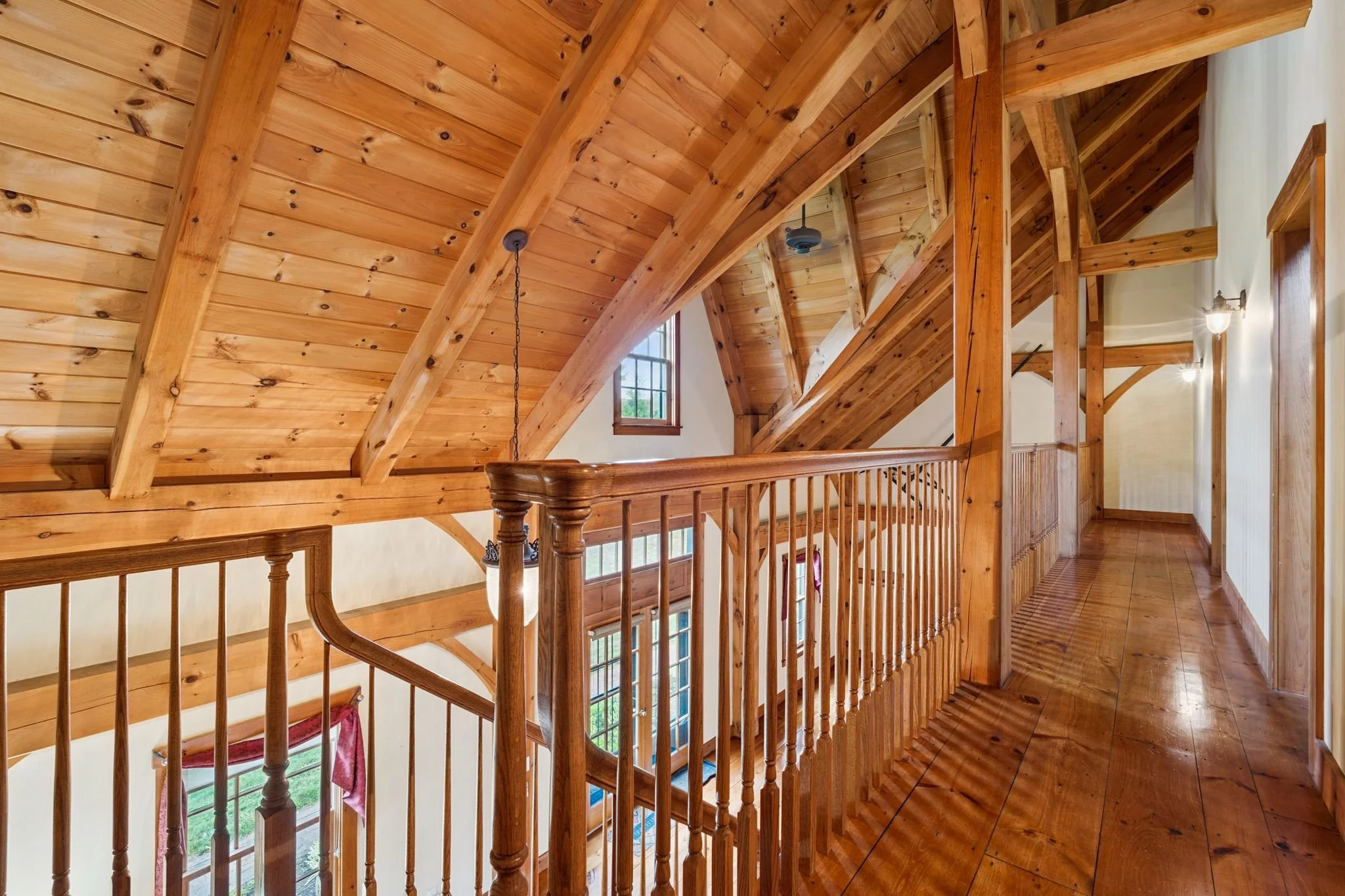 GAMBOL HILL FARM- Located in the heart of West Windsor’s horse country, Gambol Hill Farm greets you with stone walls, mature trees, open fields and paddocks throughout the property. The beautiful post and beam home, set back off the road, stands tall among the mountain views in the background. The stone patio, complete with a vine covered arbor and edible grapes, looks out over beautiful gardens and horse filled fields. A six stall barn is attached to one end of the house, allowing for easy access to the horses as well as to the outside. Inside the house, wide pine floors run throughout and lovely wood beams crisscross between the walls and ceilings. The first floor is open with a nice flow between the living room with stone fireplace to the dining area and kitchen. Beyond the kitchen is an office and a tackroom/mudroom connected to the stalls. At the opposite end of the house is a primary bedroom with en suite bath and walk-in closet and there’s a small den across the hall. Up the double railed stairway are two large bedrooms, both with en suite baths, connected by an open balcony that looks down below. This property is part of the GMHA trail network and close by is the VAST Snowmobile trail. The Brownsville Butcher & Pantry and Mt. Ascutney are just a few miles away, while GMHA and Woodstock are about 10 & 15 mins respectively. A must see for the horse enthusiast or anyone looking for country living.